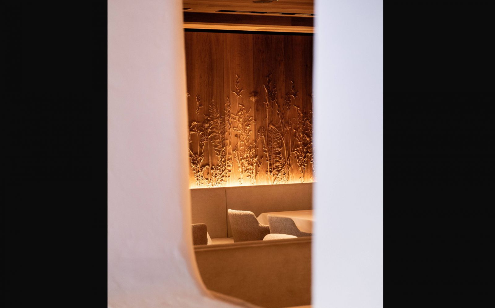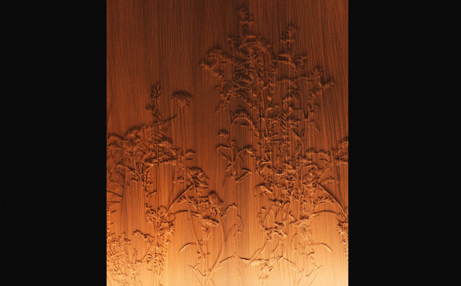 Per la realizzazione dei pannelli murali sono stati scansionati fiori veri in 3D e poi fresati su pannelli di legno. Foto di Beatrice Pilotto.